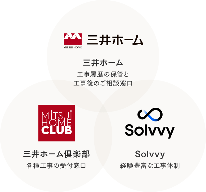 三井ホーム俱楽部オンラインショップの設備機器交換は、経験豊富なSolvvy株式会社が迅速・丁寧に行い、工事完了後のご相談は三井ホームにて承ります。