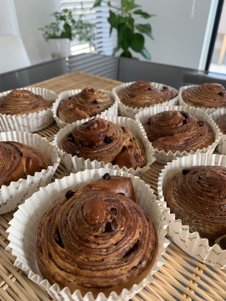 新しいお家が、美味しいパンの匂いに満たされています。チョコシートとチョコチップを使ったおやつパンを焼きました。甘い匂いに誘われ、自然と家族がLDKに集まるの、ちょっと嬉しい😋♪