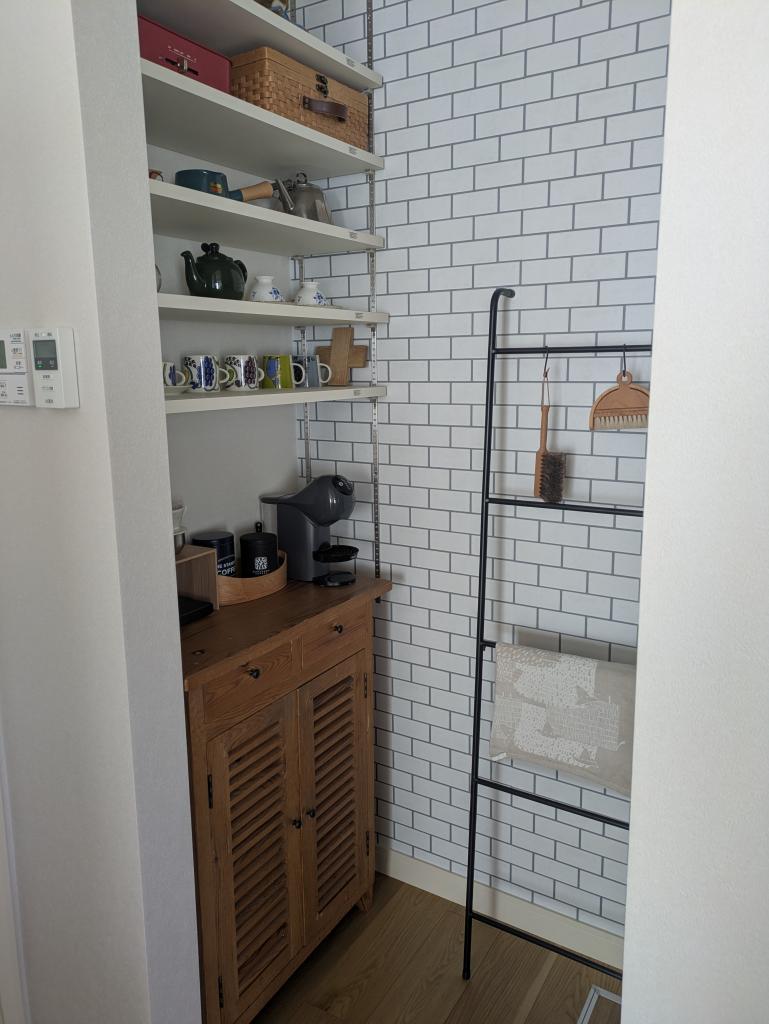 小さなパントリーを作っていただきました。反対側には、大好きなティーカップを並べて、毎日のティータイムがもっと楽しくなる空間になりました。